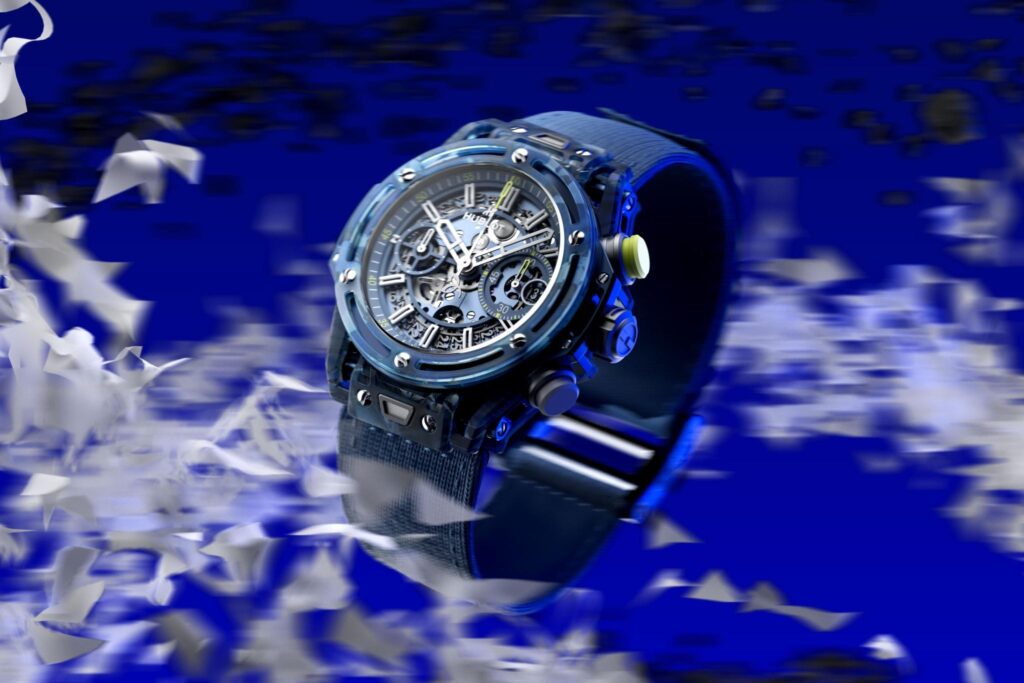 O compósito que compõe a caixa e o aro interno do relógio é feito de resina epóxi reforçada com pó de quartzo e uma cobertura de vidro que foi fundido com as raquetes e camisas polo recicladas. O material resultante é salpicado com fragmentos de tecidos azuis claros e escuros e carbono preto para criar uma aparência de camuflagem singular. Uma abordagem inovadora e representativa da ambição da Hublot de se reinventar continuamente.