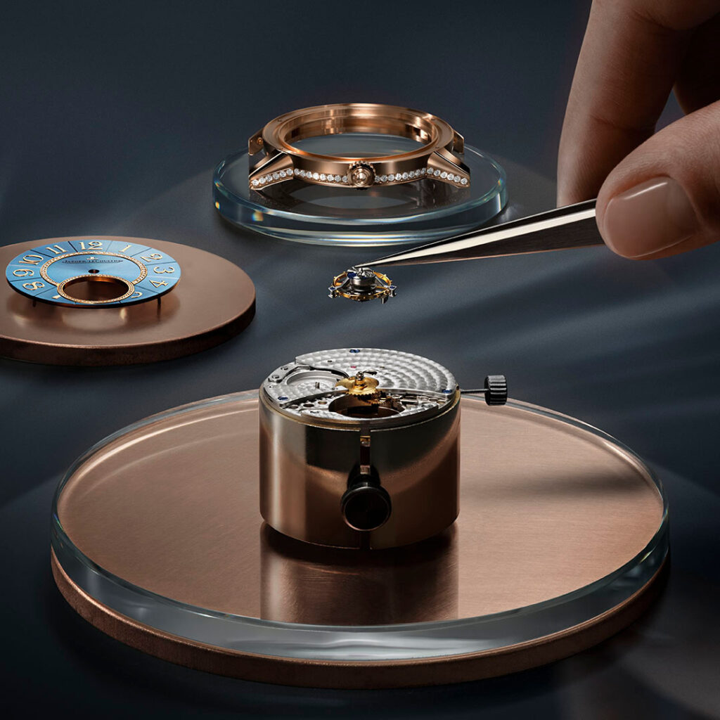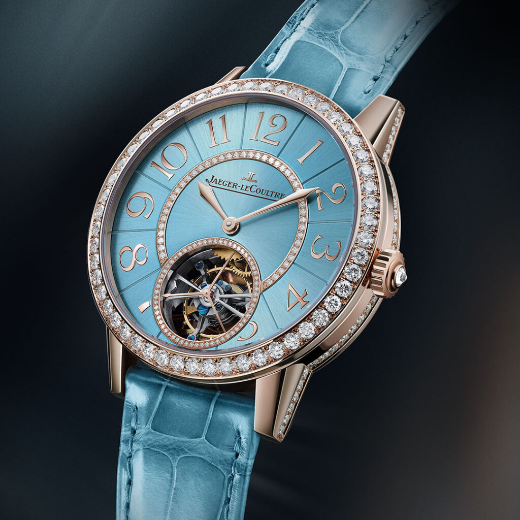 O turbilhão é realçado por um delicado mostrador Serenity Blue laqueado, um tom característico de azul, presente na coleção. Esta cor cativante valoriza a caixa em ouro rosa e a complicação do turbilhão.