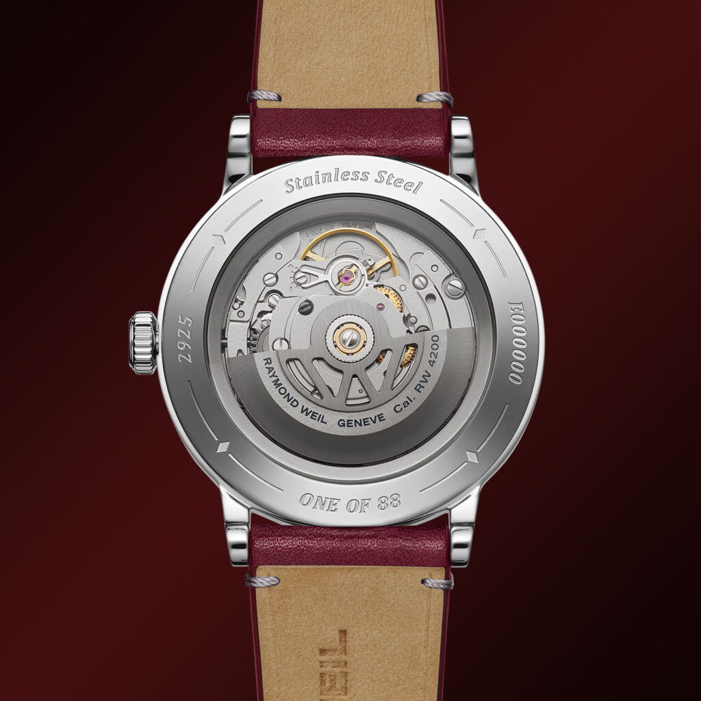 O fundo da caixa em safira permite a visualização do movimento automático interno e do peso oscilante em formato de “W”, a assinatura relojoeira da RAYMOND WEIL.