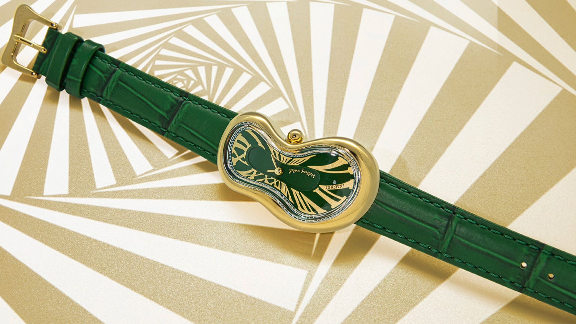 A forma oval do Exaequo Melting Watch, achatada na parte central, com um comprimento de aproximadamente 47 mm e uma largura máxima de cerca de 28 mm, apresenta uma coroa arredondada no lado direito para um fácil ajuste da hora. No mostrador de dois níveis, protegido por um vidro plástico abaulado, estão disponíveis cinco tonalidades do mostrador, nomeadamente azul, preto, branco, verde e dourado, tanto na versão com caixa em aço como em ouro. Apresentam algarismos romanos e índices contrastantes, que se harmonizam com as linhas da caixa e completam o caráter claramente surrealista.