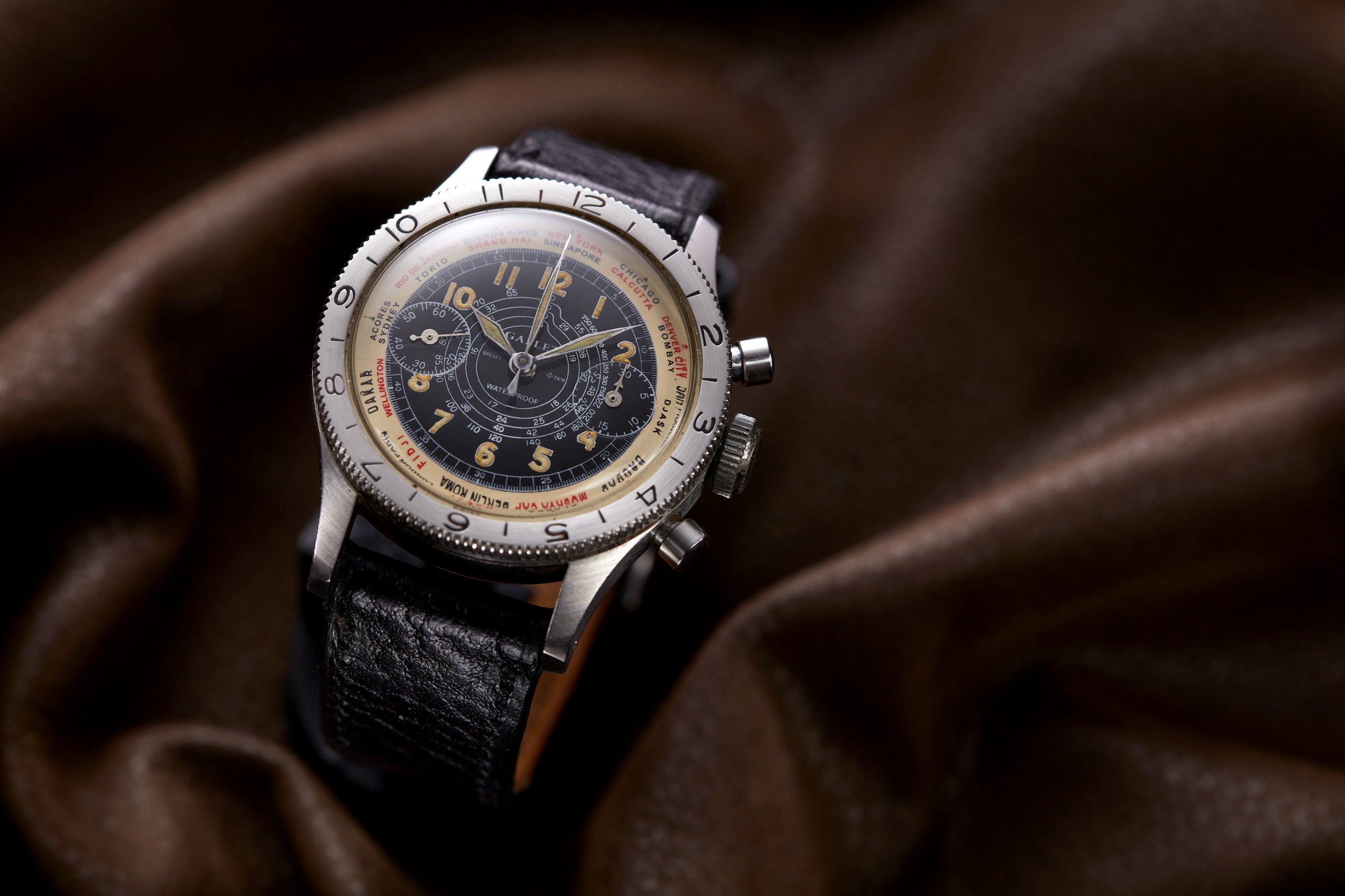 Igualmente significativo foi o MultiChron Clamshell, lançado em 1938 — um dos primeiros cronógrafos à prova de água, projetado para resistir a poeiras, humidade e chuva forte. Com várias versões adaptadas para o automobilismo, corridas de barco, aviação e outros desportos, a série MultiChron tornou-se uma pedra angular do legado da Gallet.