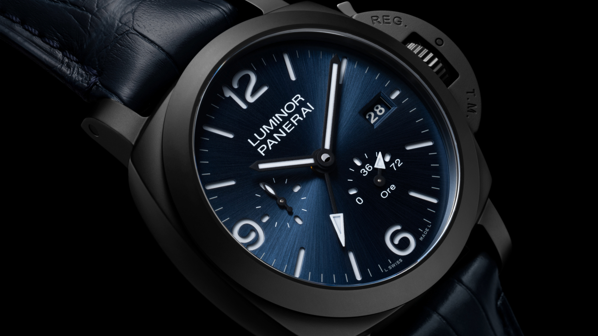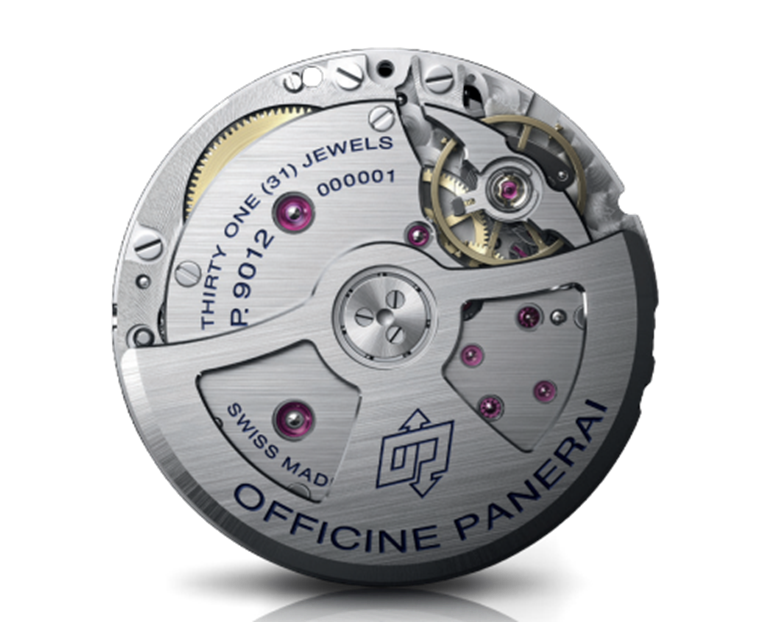 O mostrador estilo sanduíche do PAM01574 mantém-se fiel ao design funcional da Panerai: características como o dispositivo de proteção da coroa com alavanca, mostrador sanduíche e luminosidade, originalmente concebidos para fins profissionais, tornaram-se agora parte integrante do design Luminor. Ostentando um mostrador em sanduíche azul escovado pelo sol, o relógio apresenta um indicador de reserva de marcha na posição das 5 horas – com “ORE” (“horas” em italiano) elegantemente escrito no mostrador com um aceno ao estilo italiano da Panerai – proporcionando uma forma clara e prática de monitorizar a energia restante, uma característica vital para o uso diário. O ponteiro GMT de 12 horas, a janela de data biselada às 3 horas, bem como o trajeto dos minutos ao longo da borda do mostrador permitem uma leitura mais útil e precisa dos minutos. Os marcadores luminosos, os ponteiros das horas e dos minutos são revestidos com Super-LumiNova® X2 branca e verde brilhante, enquanto o indicador da reserva de marcha e o ponteiro GMT são revestidos com Super LumiNova® X1 azul.