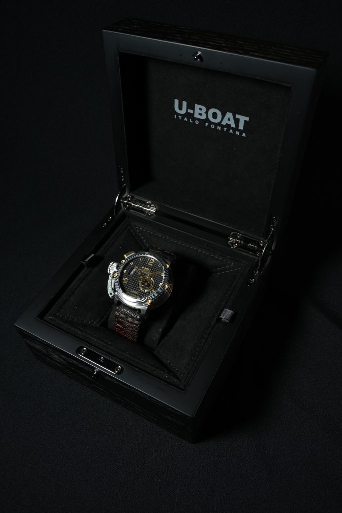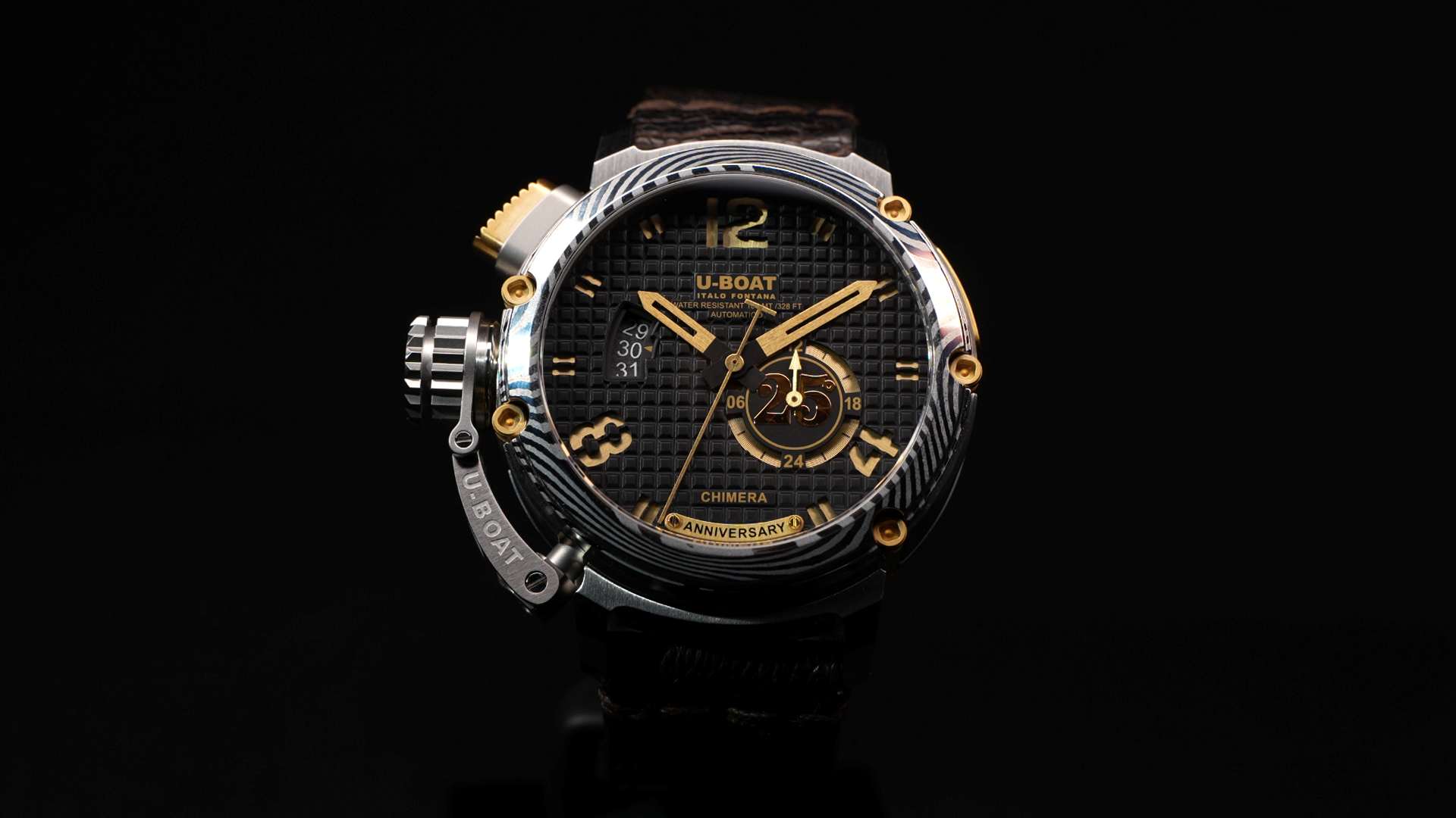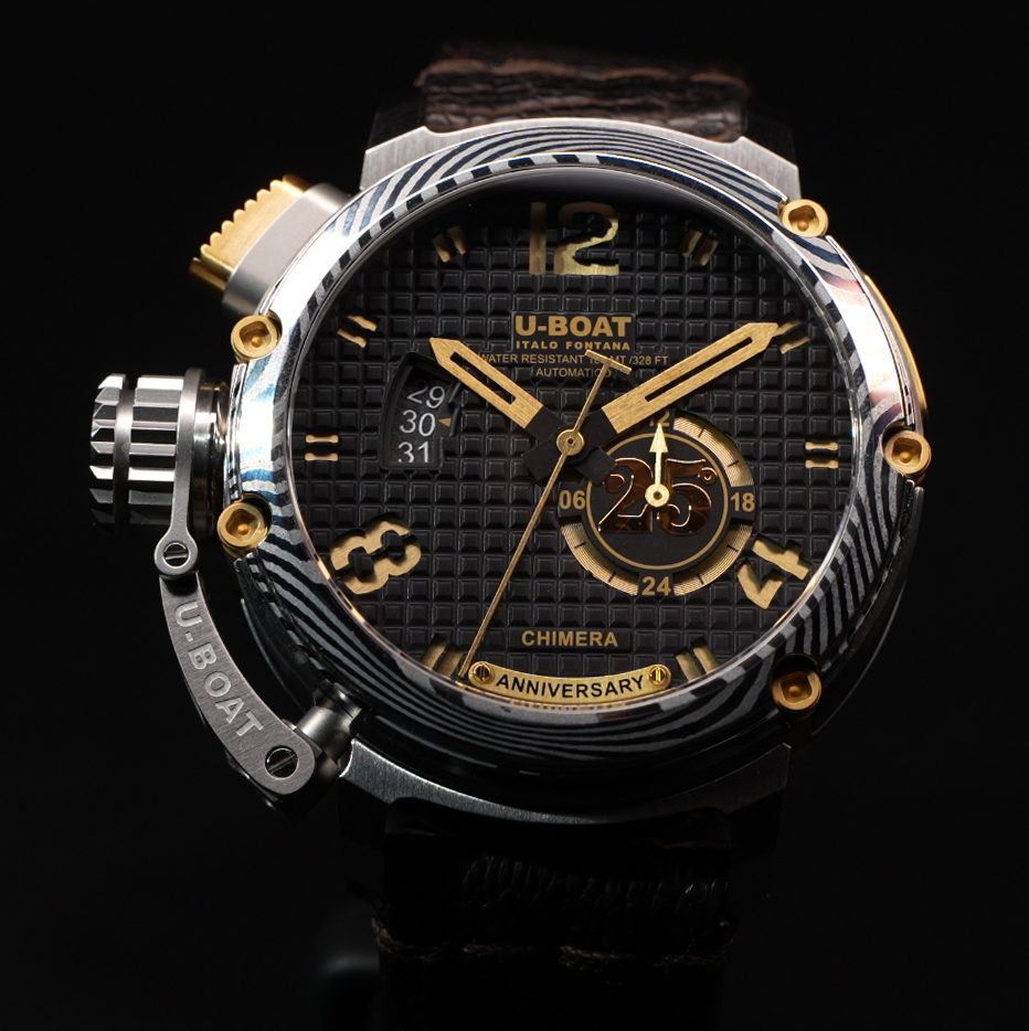 Com um total de mais de 13 gramas de ouro distribuído entre botões, placa lateral, parafusos de tensão e mostrador, o Chimera 25° é um tributo à história de sucesso da U-BOAT. Um relógio comemorativo que sopra 25 velas, mas que olha para o futuro com a mesma determinação e espírito inovador que fizeram a marca.