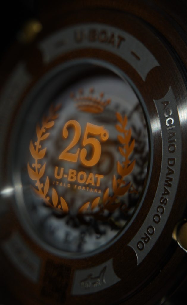 O fundo da caixa em aço apresenta uma secção central em vidro mineral, gravada com o logótipo do 25º aniversário. Para além dos cinco parafusos de tensão em ouro, o fundo da caixa é fixado com quatro parafusos adicionais que garantem a resistência à água até 100 metros, protegendo o movimento mecânico automático suíço ETA 2824 Top Soigne, modificado de acordo com as especificações U-BOAT.