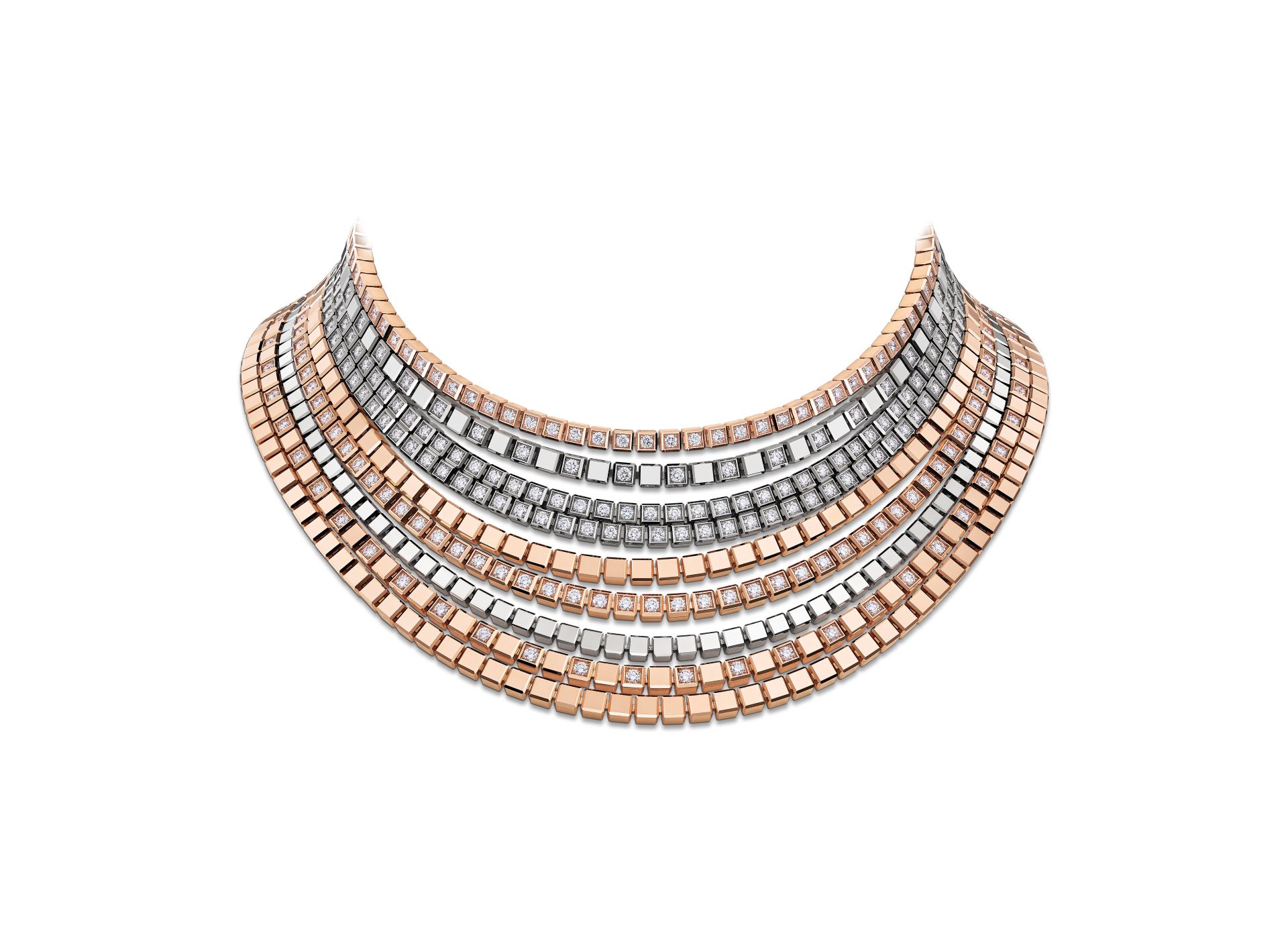 Desde 1999, a coleção Ice Cube da Chopard representa a elegância minimalista através de um único elemento poderoso. Hoje, a Maison enriquece a sua coleção cápsula de alta joalharia, lançada em 2024, para reinterpretar o seu icónico cubo com proporções ousadas, versatilidade modular e brilho escultural. Desde colares marcantes a alfinetes versáteis, passando por pulseiras luminosas e outras joias, estas criações personificam um espírito moderno e arquitetónico.