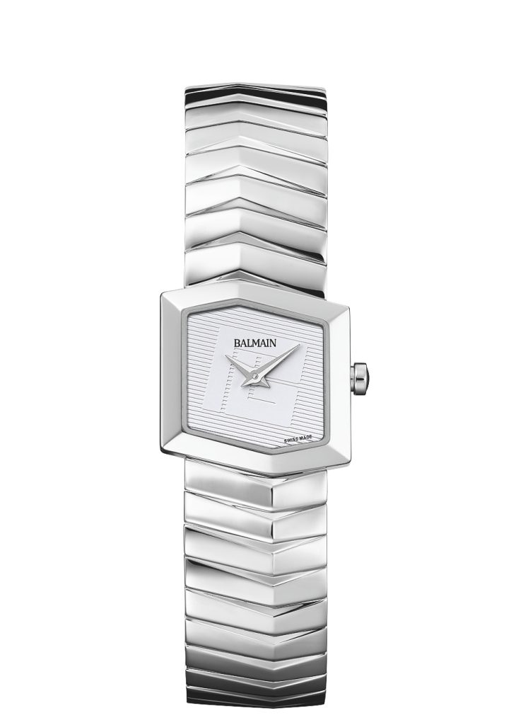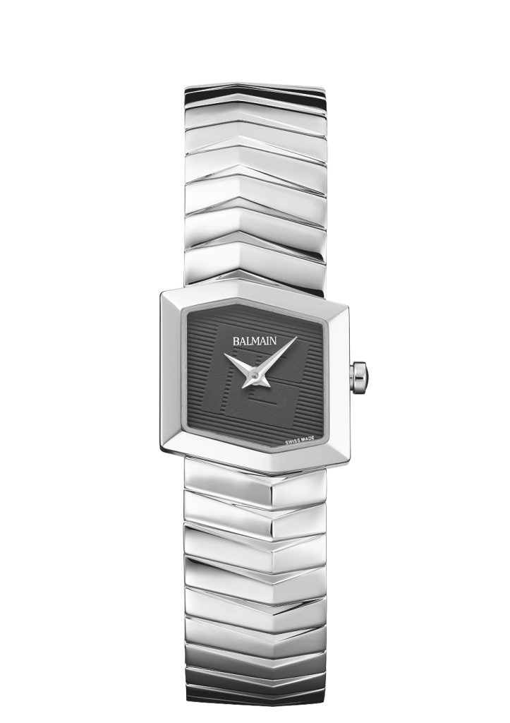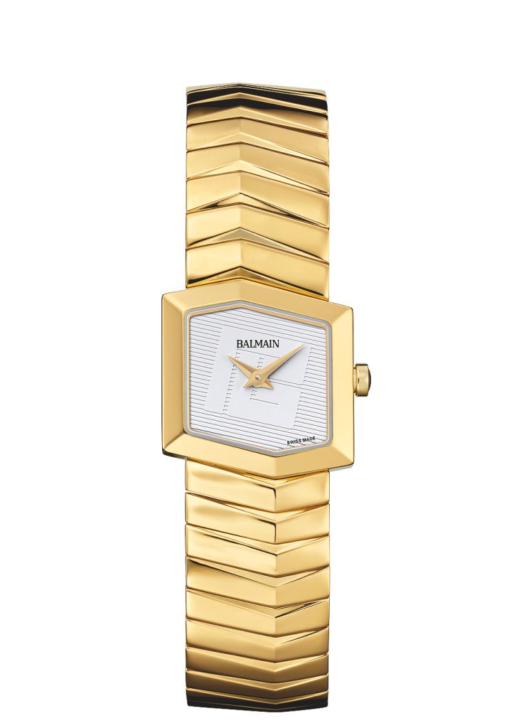 O mostrador exibe o logótipo de forma subtil, reforçando a identidade Balmain. Com um perfil feminino e um toque dinâmico, o relógio conjuga linhas suaves com volume. Entre as ligações da bracelete, o acabamento em PVD acrescenta um detalhe final pensado ao milímetro.