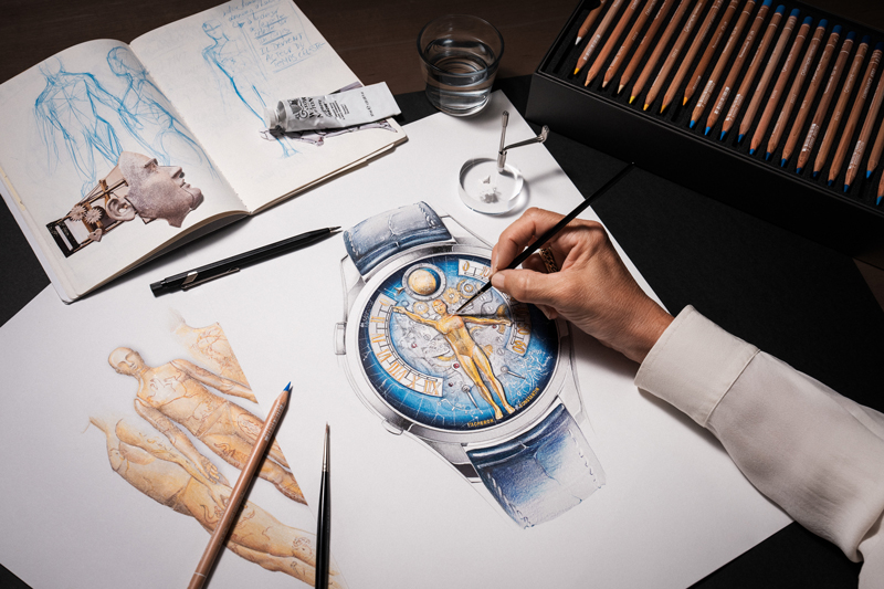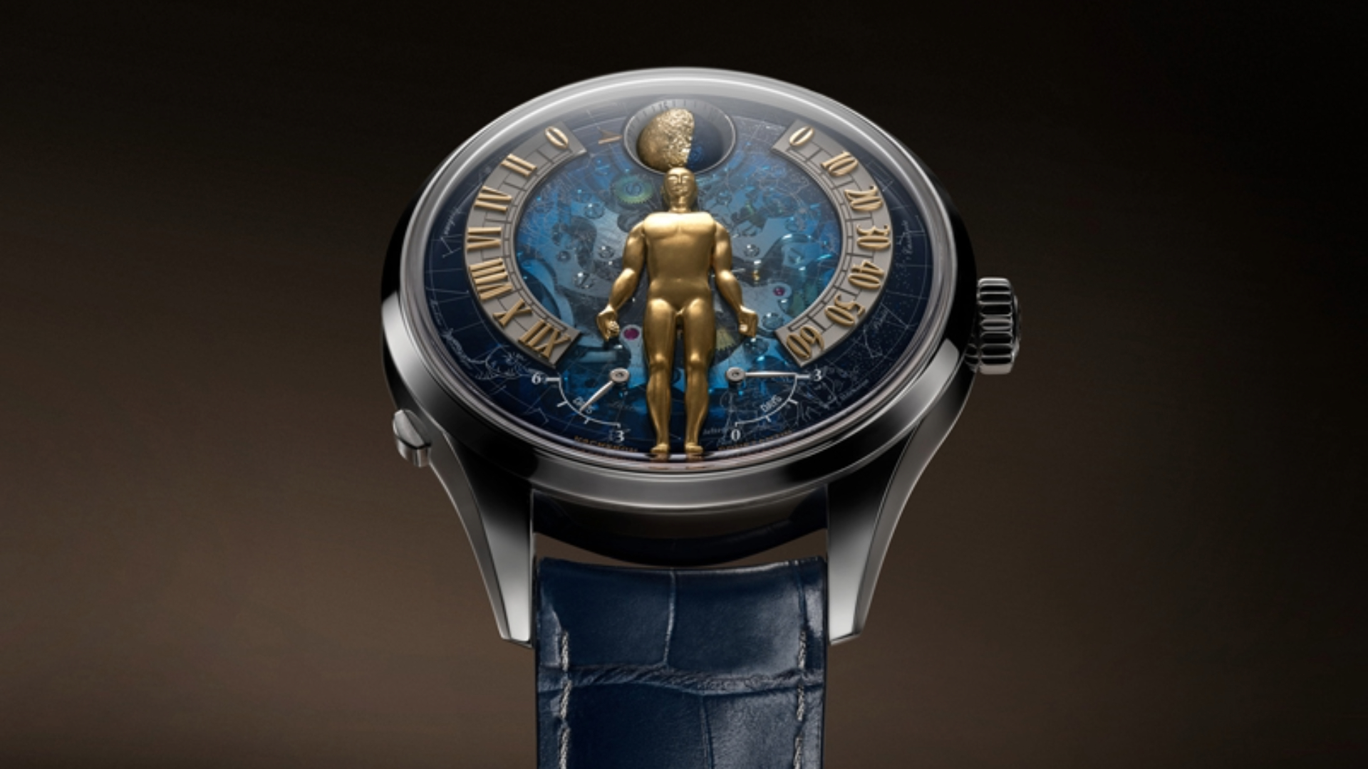 No coração da peça bate o novo Calibre 3670, um movimento de corda manual composto por 512 componentes e objecto de quatro pedidos de patente. Com uma reserva de marcha de seis dias e uma dupla exibição retrograda das horas e minutos, que pode ser apresentada em dois modos: contínuo ou a pedido, este engenhoso mecanismo permite que o tempo seja revelado com teatralidade, através de uma figura humana cujos braços substituem os ponteiros.