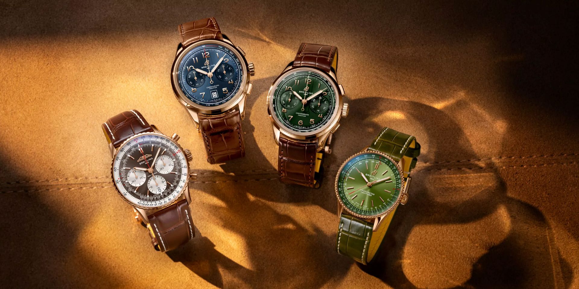 O Navitimer B01 Chronograph 41 destaca-se com mostrador castanho, submostradores brancos e a escala de cálculo característica da linha, enquanto o fundo em vidro de safira revela o movimento Manufacture com rotor esqueletizado em ouro. As versões menores — Navitimer Automatic 36 e Navitimer 32 — oferecem espírito clássico com mostradores verde ou castanho e braceletes de pele de crocodilo, perfeitas para quem procura elegância discreta com o peso e presença do ouro.