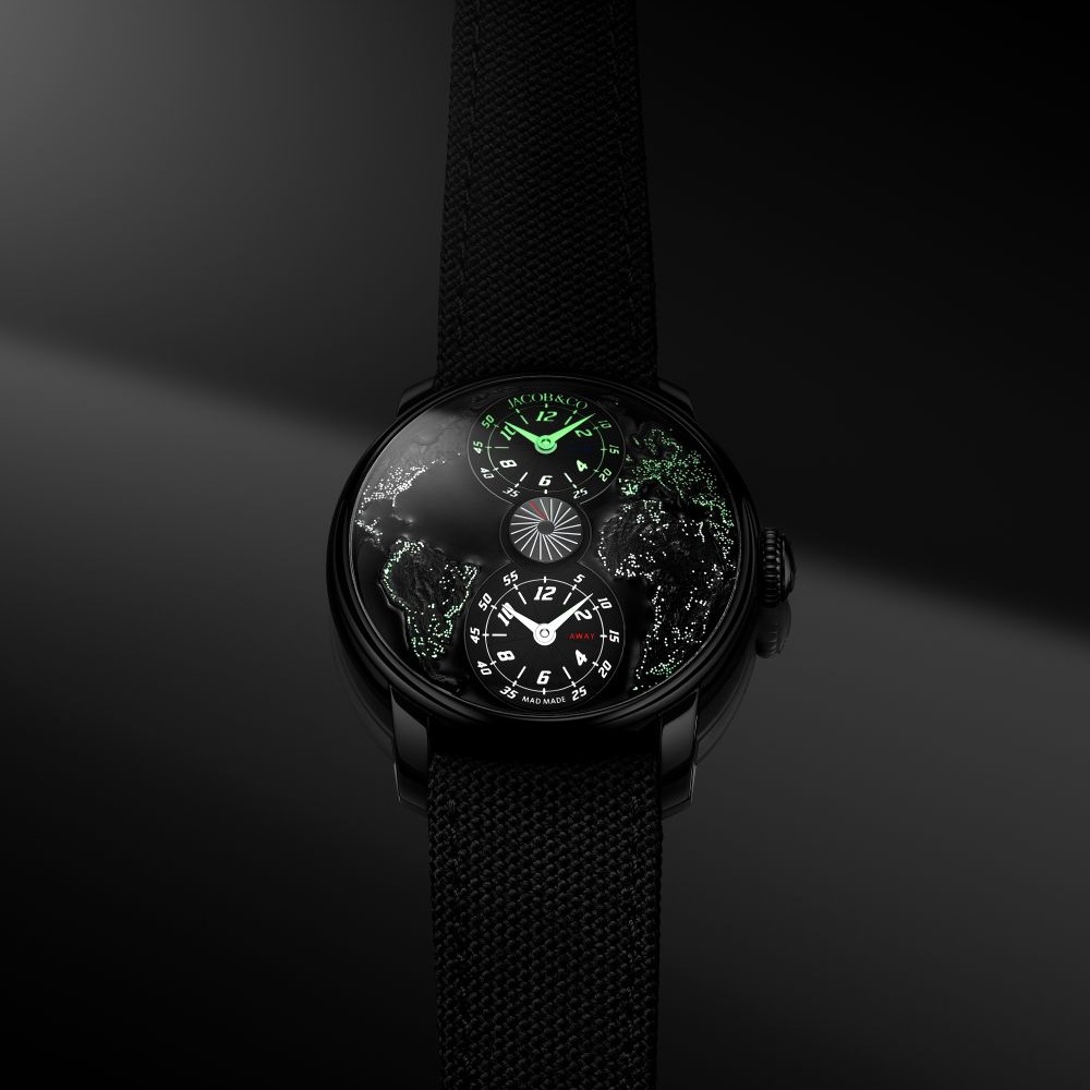 A Jacob & Co. apresenta uma versão inédita (limitada a 101 peças, cada uma numerada individualmente, disponível sob encomenda.) e colaborativa do seu emblemático relógio The World Is Yours Dual Time Zone, criado em conjunto com a casa de design MAD Paris. Esta parceria traduz-se num relógio inspirador que combina alta relojoaria com uma visão artística ousada, reforçando a tradição de inovação e narrativa emocional da marca.