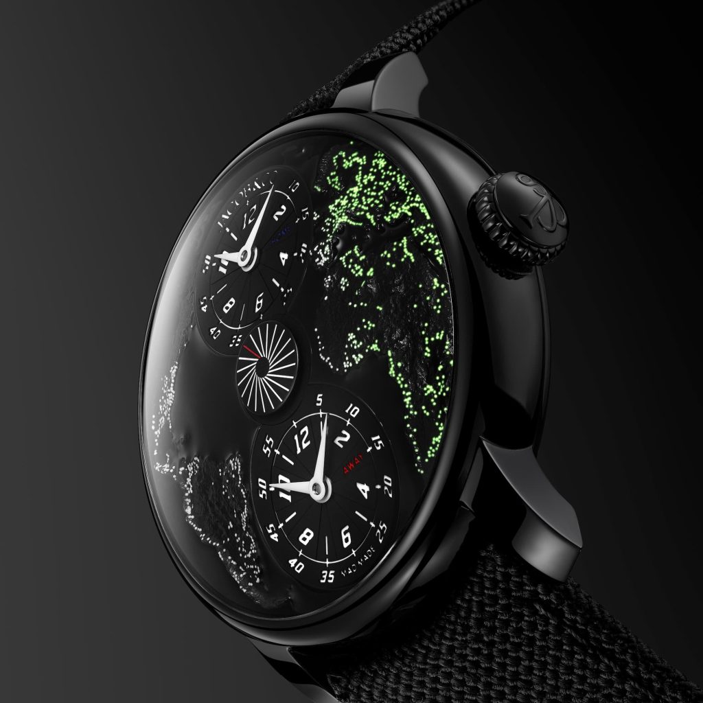 - Mostrador em titânio PVD preto com continentes gravados e preenchidos com centenas de pontos de Super-LumiNova que reproduzem luzes citadinas vistas à noite;