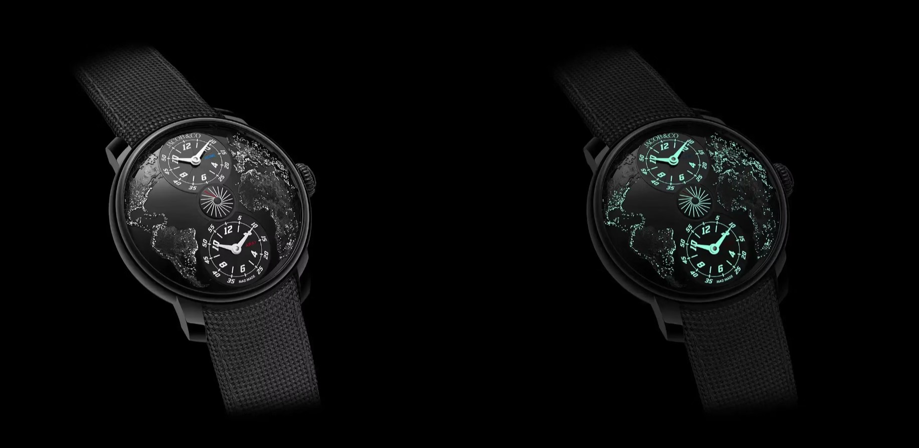 Quando as luzes se apagam, o mostrador ganha vida, exibindo um mapa mundial cheio de luzes que evocam uma vista aérea noturna da Terra — um efeito visual que transforma a leitura do tempo numa experiência artística.