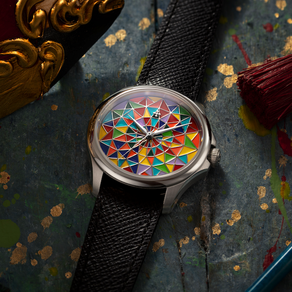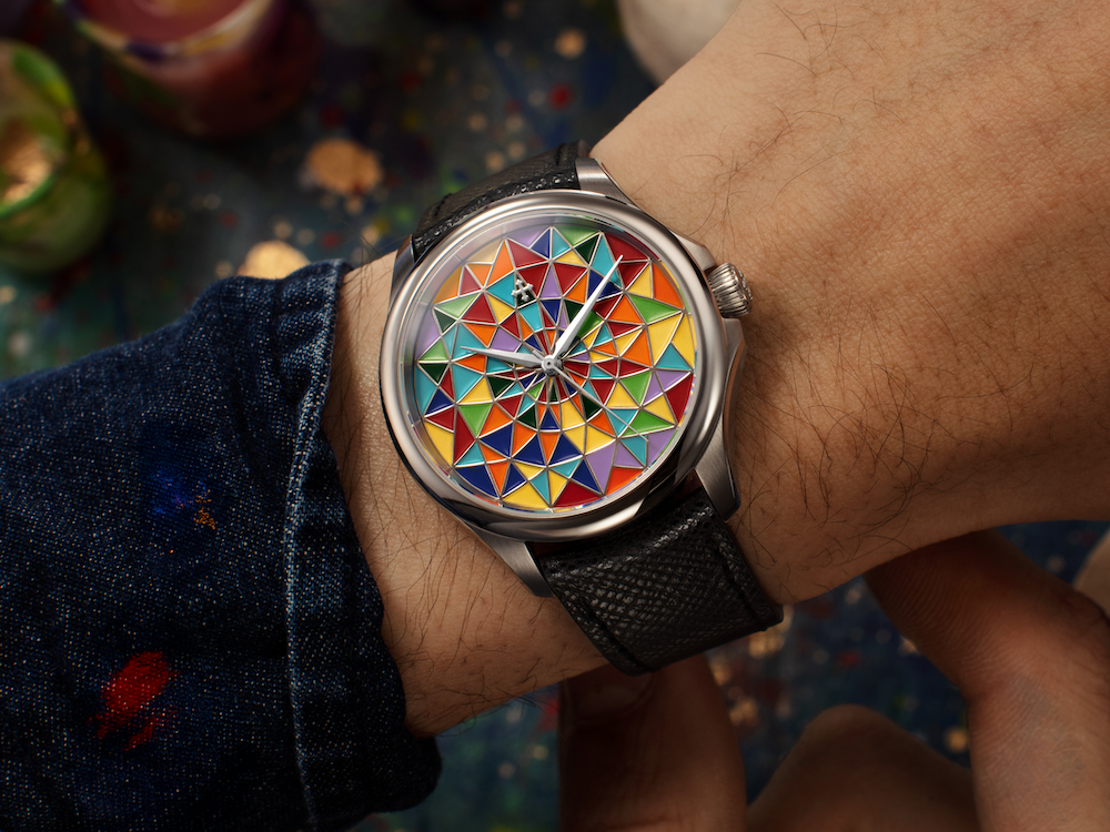 Desta visão nasce uma edição limitada a 400 exemplares, que funde o imaginário cultural com o rigor formal, transformando o mostrador numa verdadeira composição artística. A caixa de 38 mm, em aço inoxidável 316L e com apenas 9,4 mm de espessura, alterna acabamentos acetinados e polidos, criando um contraste elegante que enquadra o mostrador multicolorido sob o vidro de safira com tratamento antirreflexo, sem nunca o sobrepor.
