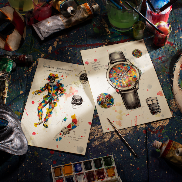 A tradição do Carnaval, em particular o veneziano — cujas origens remontam ao século XV — inspira uma nova criação baseada no clássico modelo Redentore. Nesta interpretação especial, a força e a elegância da peça revelam-se através de um mostrador multicolorido que se afirma como um verdadeiro exercício de mestria artesanal e acabamento manual.