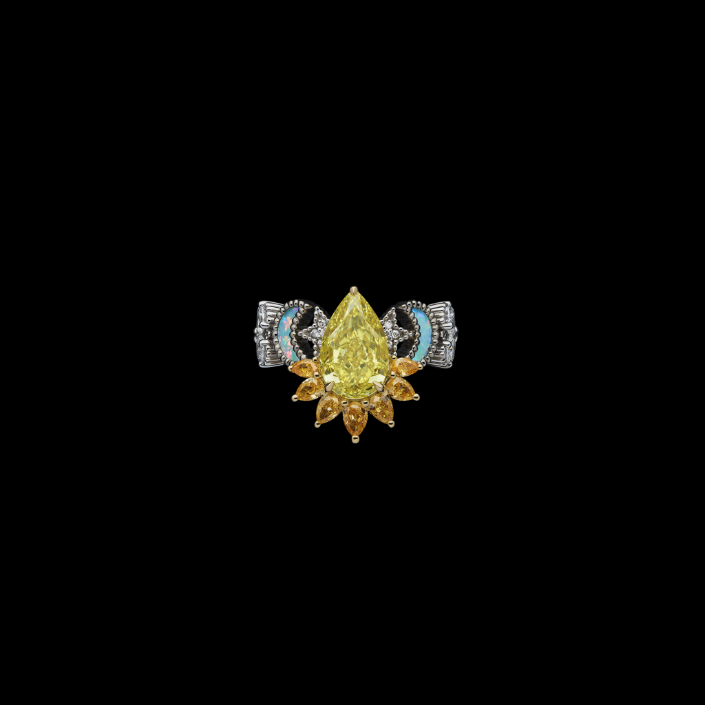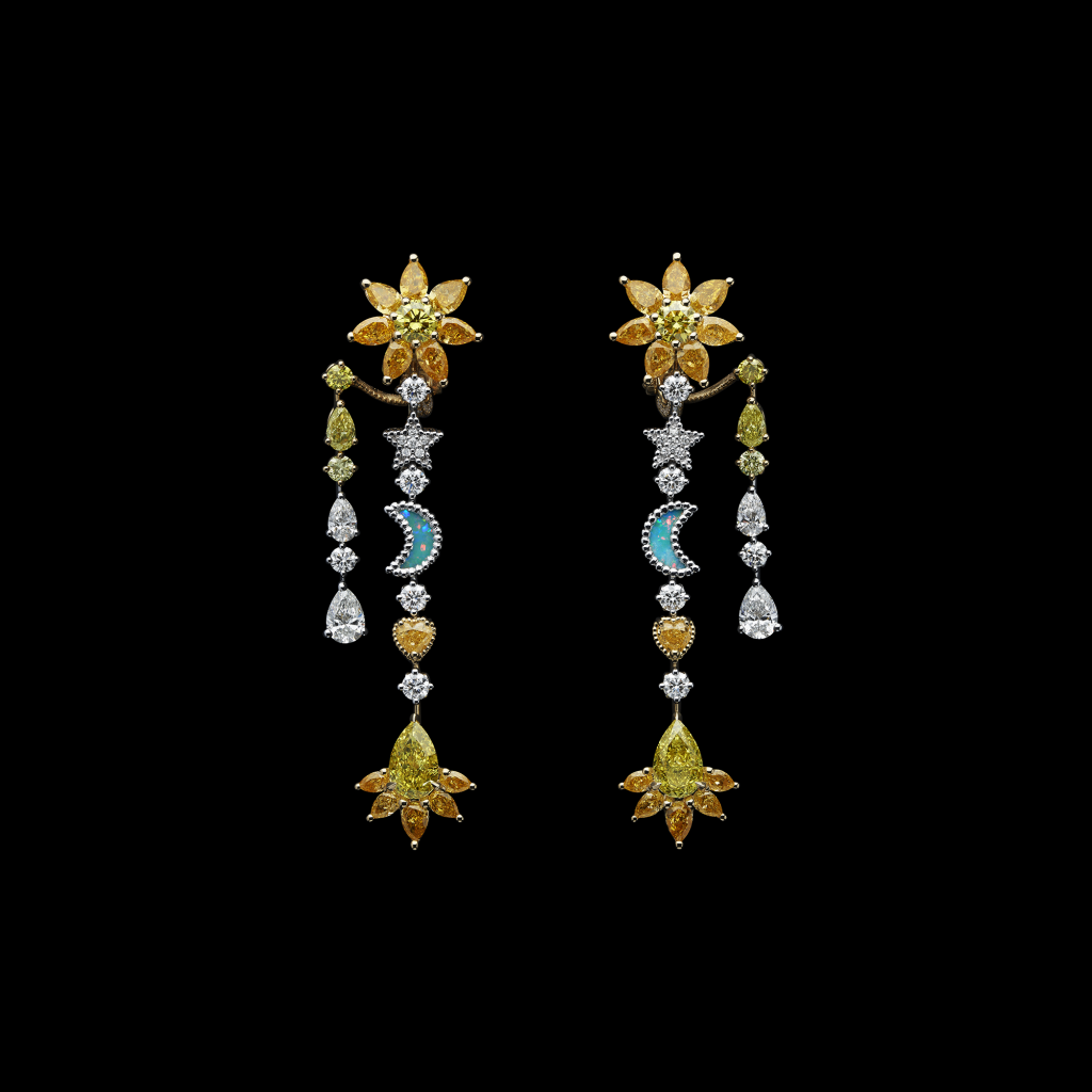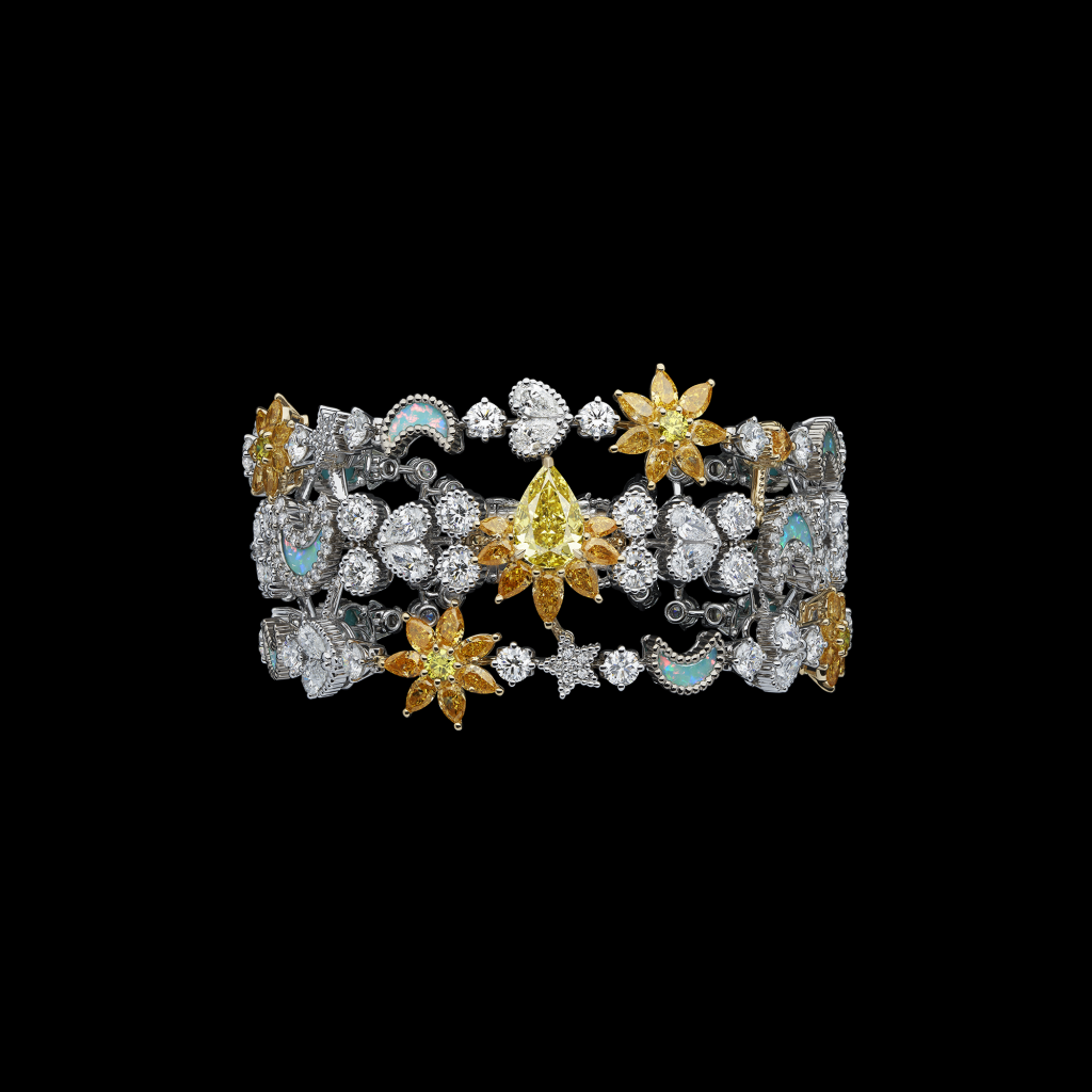 Em homenagem ao fascínio de Christian Dior pelas artes divinatórias, Victoire de Castellane concebeu um universo misterioso para o conjunto Soleil Céleste. Diamantes amarelos, estrelas e luas radiantes e cintilantes e esculpidas em duplos de opala negra incrustados em turquesa compõem um colar tipo babete, um anel, brincos e uma pulseira que pode ser transformada em gargantilha, bem como um broche que também pode ser usado como acessório de cabelo – símbolos talismãs do destino.