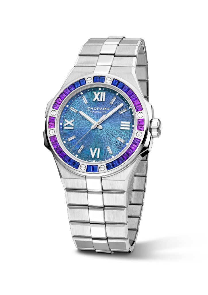O ator selecionou um relógio Alpine Eagle Summit com 18k em ouro branco com um mostrador Zinal Blue e 3,02 quilates de safiras azuis e roxas, um pendente Happy Diamonds em ouro branco 18k com 0,40 quilates de diamantes.
