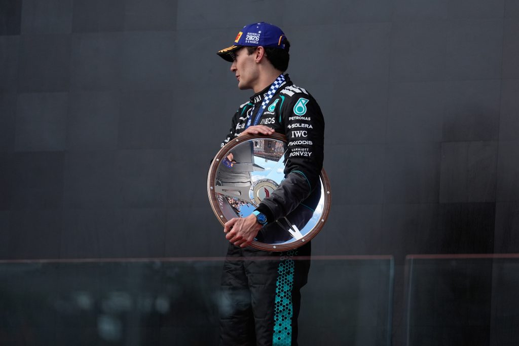George Russell, da Grã-Bretanha, e a equipa Mercedes AMG Petronas F1 comemoram no pódio a vitória no Grande Prémio da Austrália de Fórmula 1, no Circuito de Albert Park, em Melbourne, Austrália, a 8 de março de 2026.