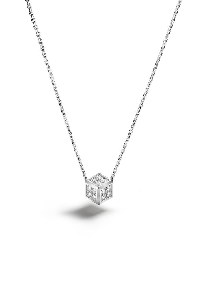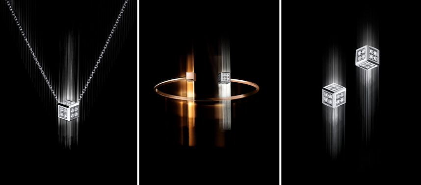 Inspirada nas seis faces do cubo, esta nova linha divide-se em duas abordagens distintas. Por um lado, três peças assimétricas — gargantilha, anel aberto e pulseira rígida — que combinam cubos de diferentes dimensões numa composição subtilmente torcida, criando um jogo dinâmico entre volumes e proporções. Por outro, três peças mais minimalistas — colar com pendente, brincos e pulseira de corrente — apresentam um único cubo, disponível em ouro rosa polido ou ouro branco com diamantes.