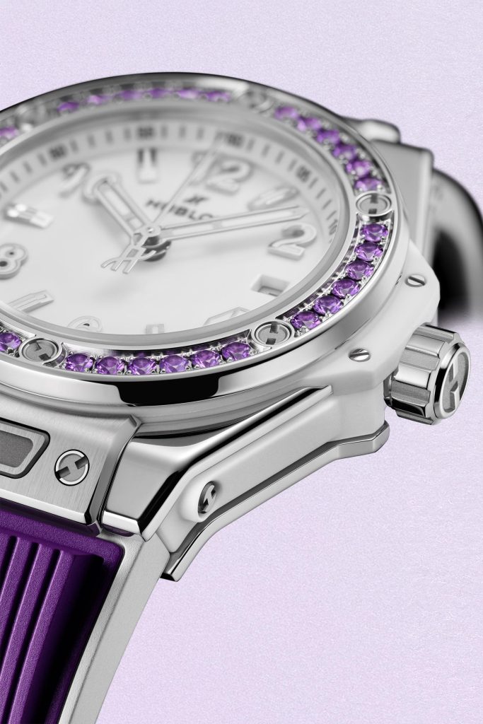 O novo relógio integra a coleção Joyful, conhecida pela combinação de pedras preciosas e tons intensos. Nesta edição, o destaque vai para o roxo ametista, presente tanto na luneta — adornada com dezenas de pedras cuidadosamente lapidadas — como na bracelete de borracha, criando uma estética uniforme e marcante.
